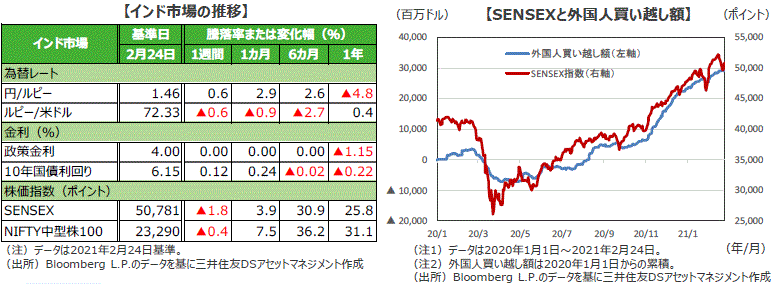 ■インド株式市場は、2月1日に発表されたインドの予算案を受けて、経済再生に重点を置く政府の姿勢が好感され、大幅に上昇しました。代表的な株価指数のSENSEX指数は、3日に初めて終値ベースで節目の50,000ポイントに乗せました。その後も予想を上回る決算などから買いが続き、15日には52,000ポイント台まで上昇するなど、連日で過去最高値を更新しました。ただ、その後は利食い売りに押される展開となり、22日には50,000ポイントを割り込むなど、SENSEX指数は反落し、上昇一服となっています。