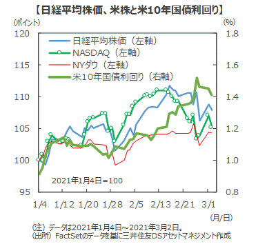 ■米国10年国債利回りは3月に入りやや落ち着きを取り戻しつつありますが、景気回復の強まりを受け、長期金利は年後半に向けて緩やかに上昇すると予想されます。短期的には、今週末の米雇用統計などが注目されます。雇用の拡大が確認できれば、株式市場は、「景気回復期待」に注目して堅調に推移すると考えられますが、まず、長期金利の反応を確認しながらの展開となりそうです。今後は主要なマクロ統計やバイデン政権の景気対策の規模、米連邦準備制度理事会(FRB)高官の景気や物価、金融政策に対する発言などに一喜一憂する場面が続きそうです。なお、大局的には、米国も日本も、21年、22年と景気・業績が回復し、成長していく局面にあります。今後は業績相場の色彩を強めると考えられ、これが主軸になると期待されます。日本の株式市場は、業績主導の相場へ移行する過程で、振れ幅の大きな展開が想定されますが、好調な業績を支えに上昇基調を維持すると考えられます。