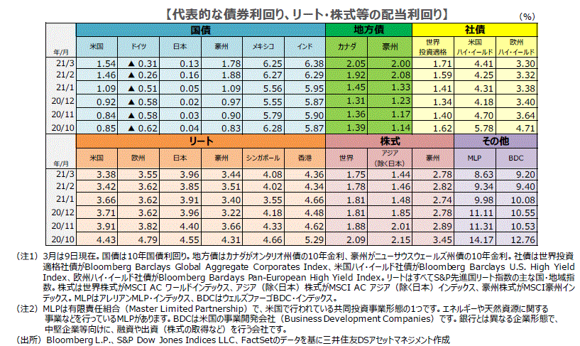 ■米国の大規模な追加経済対策やワクチン効果による景気回復が期待される中、米国債利回りは2月、3月と上昇が続いています。他の国債利回りも2月は総じて上昇しました。投資適格債の利回りは米国債の利回り上昇に連れて上昇しました。米国ハイ・イールド債は2月に利回りが低下した後、3月に上昇に転じました。欧州ハイ・イールド債は緩やかながら利回りの低下傾向が続いています。
