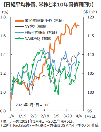 ■米国ではワクチンの接種も順調に進んでいることから、市場は、米国はコロナ対策にめどが立ち、ようやく成長戦略へと舵を切った、とみなし始めており、期待形成の分岐点に差し掛かったと思われます。日本はこれからワクチンの接種が本格化しますが、米国金融市場の落ち着きと、業績の上振れ期待から、日本の株式市場も堅調さが増すと考えられます。