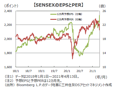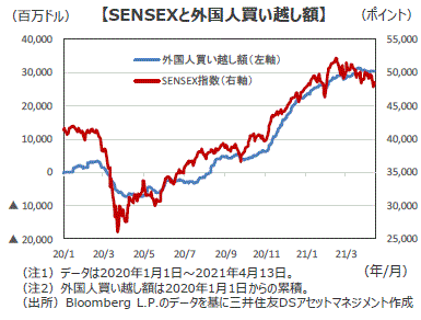■インド株式市場は、新規のコロナ感染者数が増加していることから当面上値の重い展開が続くものの、行動規制やワクチンの普及により感染拡大に歯止めがかかれば、好調な企業業績や景気回復期待、金融緩和政策の継続を背景に、見直し買いが入ると思われます。インド経済の成長期待で海外投資家からの資金流入が継続していることも株式市場の持ち直しを後押ししそうです。