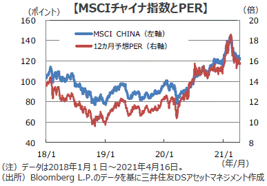 ■主要指標の発表を受けた中国株式市場は、総じて堅調な内容を好感し、MSCIチャイナなどの指数が上昇しました。しかし、経済が好調にもかかわらず、同指数は2月のピークから約15%下落しています。これは景気が強いため金融引き締め懸念が強まったほか、テクノロジー企業に対する独禁法適用の厳格化や米中対立激化への懸念の再燃等が背景です。ただ、バリュエーションは予想PERで15倍程度に低下しており、割高感が後退していることから、今後中国株式市場は堅調さを取り戻すことが期待されます。