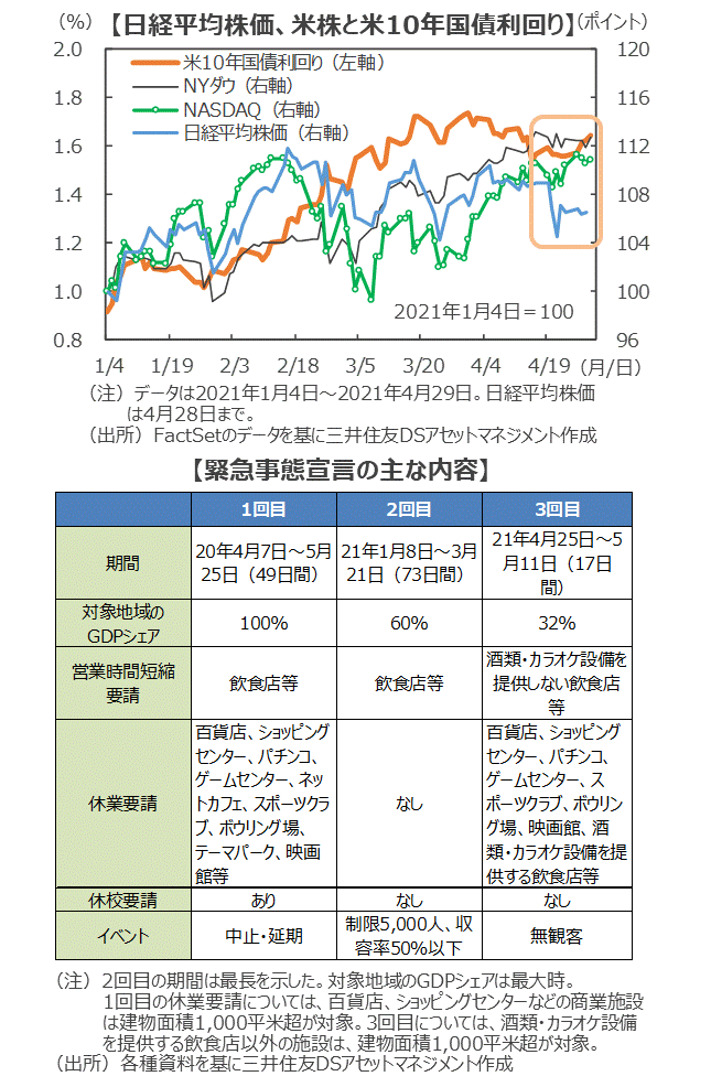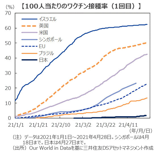 ■日本株式市場は、国内要因では引き続き新型コロナウイルスの感染状況とワクチンの接種状況に注目する必要があります。米国では新規感染者が増加しても、ワクチン接種の広がりが加速したことで景気の回復期待が後押しされ、株式市場にプラスの影響を与えました。日本も、ワクチン接種が本格化することで、景気回復への期待が高まると考えられます。政府によれば、ファイザー社のワクチンが連休明けから毎週約1,000万回分ずつ日本に供給される見通しです。さらに、9月末までにファイザーから8,700万人分、モデルナから2,500万人分のワクチンが供給される予定とみられ、16歳以上の接種対象者をすべてまかなえる見通しです。ワクチン接種は7-8月頃から加速すると思われ、同時に新規感染者数の抑制が確認されれば、年後半以降の景気・業績の回復に対する期待は大幅に改善されると思われます。