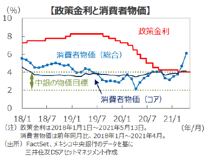 ■メキシコ政府はこれまで財政による景気刺激策には消極的で、もっぱら金融緩和で景気の下支えを図ってきました。しかし、足元ではエネルギー価格の高騰などを背景にインフレ率が大きく上昇し、金融政策決定会合後の声明でもインフレへの懸念を滲ませており、更なる政策金利の引き下げは躊躇せざるを得ない状況にあります。
