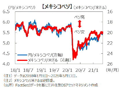 ■財政は健全で、与党への高い支持率から政局も安定し、更に頼みの米国経済も力強い回復が期待されることから、メキシコのファンダメンタルズは良好です。このためメキシコペソは堅調な推移が見込まれ、昨年の急落前の水準を目指す展開が今後も続くものと考えられます。