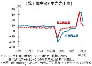 ■4月の小売売上高は前年同月比+17.7%と、前月の+34.2%から伸び率が大きく鈍化し、市場予想の+25.0%を下回りました。業種別にみると、新型コロナウイルスの影響で前年に低迷した反動で飲食業は+46.4%と高い伸びでしたが、前月の+91.6%からは減速しました。