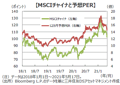 ■主要指標の発表を受けた17日の中国株式市場は、順調な景気回復との見方から、MSCIチャイナなどの株価指数が上昇しました。このところ米中対立などから株価が調整していますが、バリュエーションは予想PERで15倍割れに低下し、割高感が後退していることから、株式市場は堅調さを取り戻すと期待されます。