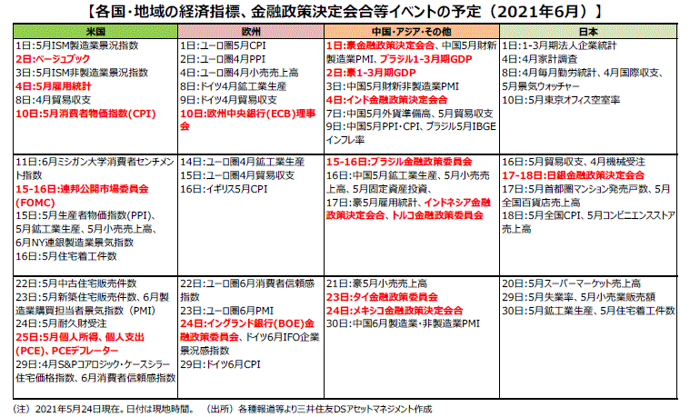 ■このため、金融市場では米欧のテーパリング(量的緩和の減額)が意識されはじめています。現状では米連邦準備制度理事会(FRB)や欧州中央銀行(ECB)は金融緩和政策を維持する姿勢を示していますが、6月に開催される米連邦公開市場委員会(FOMC)やECB理事会では、テーパリングに対する示唆があるか否かが注目されます。一方新興国では、インフレ懸念の有無によって金融政策の方向性が異なっています。既に利上げを開始している国については、今後も利上げが継続されるのかが注目されます。