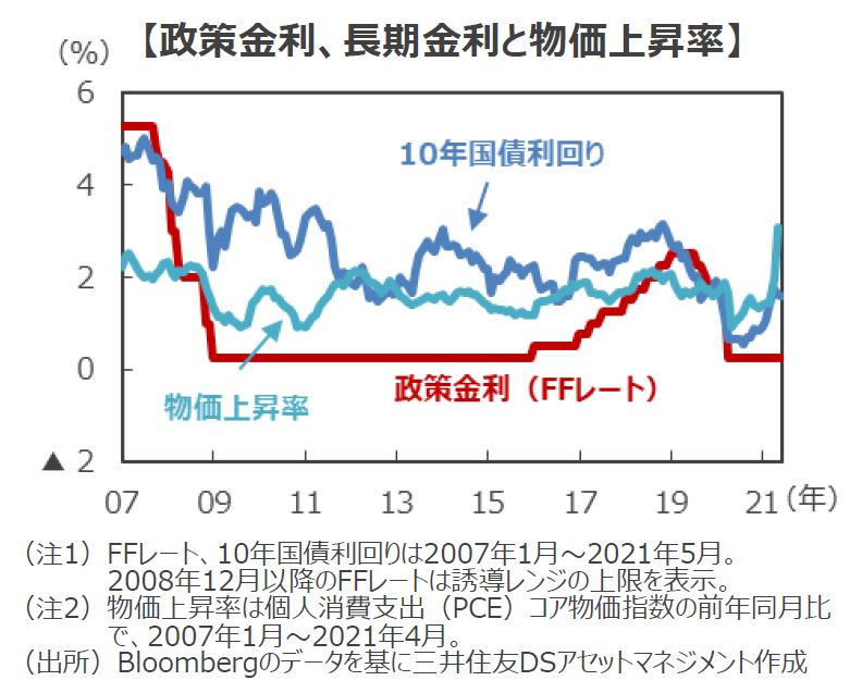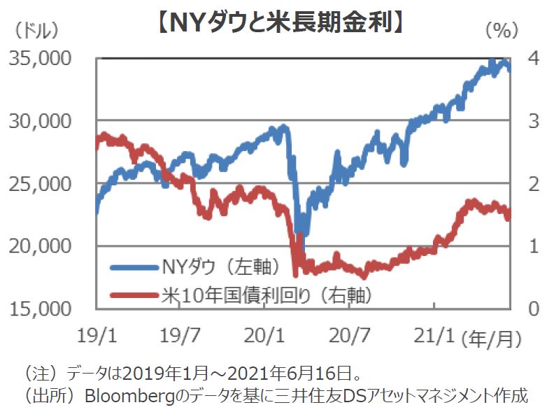 ■16日の米国市場では、株式市場、債券市場ともに下落しました。利上げ予想の中央値が上方修正されたことで、金融緩和縮小への警戒感が出たことが理由です。ただし、パウエル議長はFOMC後の記者会見で、「利上げ予想は参加者個人の予想であり、FOMCとしての予測や計画ではない。今回の会合では利上げをいつ実施すべきという議論はなかった。利上げの議論は時期尚早だ。」と述べました。インフレについても、「供給制約で一時的に上昇した価格はいずれ落ち着くだろう」と述べています。こうしたことから、金融緩和の縮小はきわめてゆっくり行われると見られます。今後の市場については、金融緩和縮小が意識されつつも、企業業績拡大によって株価は上昇を続けると予想します。