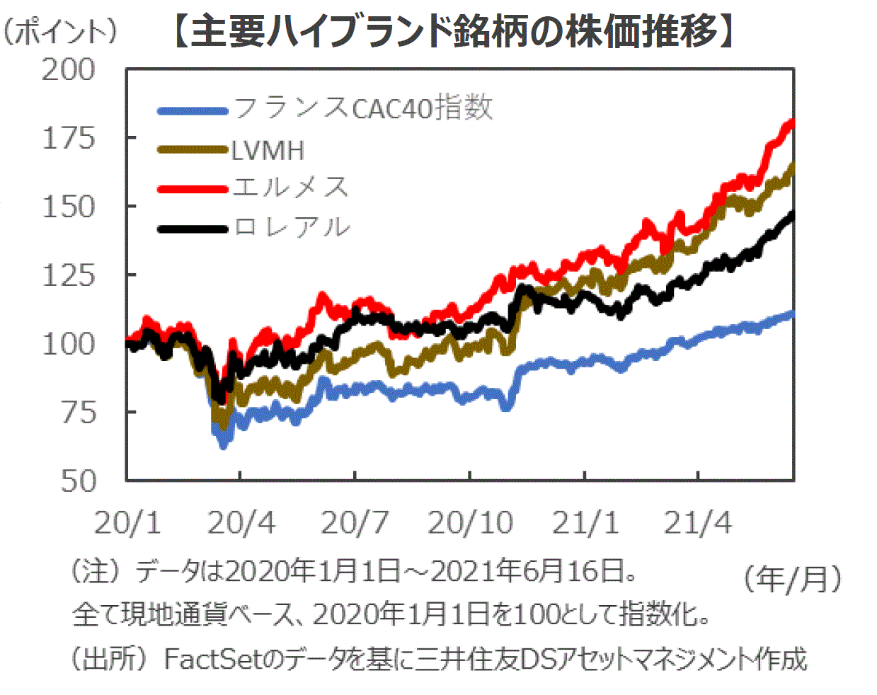 ■危機に対するストレス耐性もハイブランド株の強みです。昨年3月、コロナウイルスの感染拡大から世界の金融市場は大きく動揺しましたが、欧州ハイブランド株は総じて底堅く推移しました。同時期のCAC40は年初来で4割近く値下がりしましたが、LVMHは約3割、エルメスやロレアルは約2割の下げ幅に留まりました。