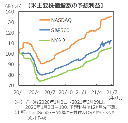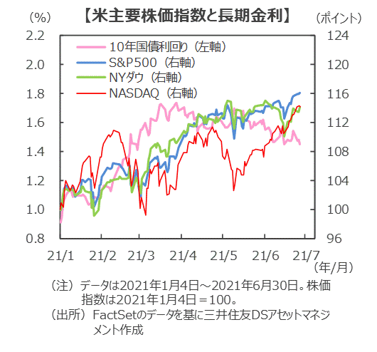 ■ハイテク株が堅調に推移しているのは、米景気が今後もしっかり推移するとの見通しが維持されながら、長期金利の上昇が止まったことで、バリュエーション面での懸念が低下したことが要因です。こうした状況に至ったのは、6月22日の米連邦準備制度理事会(FRB)のパウエル議長が利上げを急がないとの議会証言により市場の早期利上げ懸念が和らいだこと、また、バイデン大統領がインフラ投資で超党派の上院議員との合意に至ったことなどが背景です。
