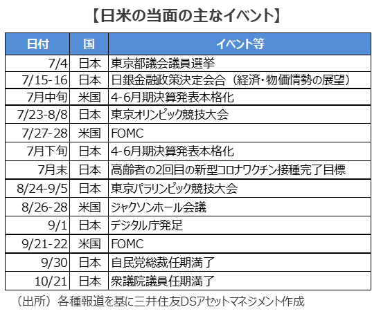 ■国内では7月23日に東京オリンピック、8月24日に東京パラリンピックが開催され、ワクチン接種の加速、デルタ株の感染拡大懸念が同時に進むことになります。一方、米国では、7月下旬の米連邦公開市場委員会(FOMC)、8月下旬のジャクソンホール会議で、資産買入の縮小(テーパリング)の時期や進め方など、今後の米金融政策の方向性を確認することになります。また、7月は前半から米国、下旬以降は日本のそれぞれ企業決算が発表されます。そして9月以降、日本は政局となる見通しです。