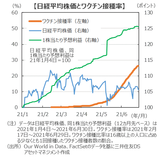 ■東京オリンピック・パラリンピックが感動を与える大会となることを期待しつつ、市場の関心事はワクチン接種が目に見えて加速化するかです。6月29日現在、日本の接種率は26.4%(1回接種、16歳以上人口比)です。ここまでに約4カ月と米国の2.8カ月に比べれば時間はかかっていますが、接種スピードは加速化する方向です。また、集団免疫が確保されるといわれる70%に達するのは10月第1週と試算されます。ワクチン接種の加速が確実となれば、米国で確認されたように、経済活動の再開と企業業績に対する自信につながり、日本においても市場センチメントの好転に寄与すると考えられます。