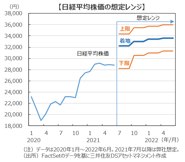 ■このように市場の期待に影響を与えうるテーマは事欠きませんが、今後を見通す上で核となる企業業績について最後にまとめたいと思います。弊社は、過去最高益更新のタイミングを22年度から21年度に前倒ししました。米国の成長が加速し、年末から来年にかけて欧州や日本の回復も期待できます。日本の輸出企業にとっては大きな追い風となります。ワクチン接種が加速すれば70%に達するタイミングの前倒しもありえ、非製造業の回復に対する期待も膨らむ可能性があります。7月下旬以降の4-6月期決算発表、10月以降の年度上期の決算発表時では、予想利益の上振れが見込め、外部環境の好転もあって株式市場のモメンタムは大きく改善する見通しです。弊社は日経平均株価(着地ベース)は9月末で3万2,000円台、12月末で3万3,000円台を目指すと想定します。
