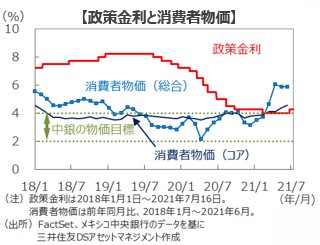■弊社では、メキシコ経済の回復傾向が鮮明になってきたことから、インフレと政策金利の見通しを上方修正しました。2021年通年での消費者物価総合指数の予想を先月の+4.5%から+5.0%に、2021年末の政策金利の予想を従来の4.5%から4.75%に、それぞれ引き上げました。