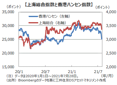 ■中国・香港株式市場が大きく調整しています。先週金曜日(7月23日)から7月28日までの3営業日の下落率は、中国本土市場の上海総合指数が▲5.3%、香港ハンセン指数は▲6.8%となりました。これは中国当局の規制強化がIT(情報技術)プラットフォーム企業から教育産業と、幅広い産業に広がっているためです。規制強化の対象となった企業の株価は大きく下落しましたが、株式市場全体に規制強化を嫌気するムードが広がっています。