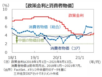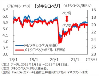 ■ただし、足元で新型コロナウイルスのデルタ型の感染が急速に拡大しており、景気への影響を注視する必要がありそうです。また、米国の金融政策の変更が予想外のスピードで進む場合には、資本の海外流出への懸念からメキシコペソも調整する可能性があり、注意が必要です。