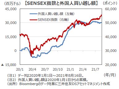 ■インド株式市場は、好調な企業業績や金融緩和政策の継続に加えて、新規感染者の落ち着きに伴う景気回復期待を背景に、今後も堅調に推移すると期待されます。ブルームバーグによるSENSEX指数の予想EPS(1株当たり利益)は足元で一段と伸びており、このところ一服している海外投資家の買いがインド企業の成長期待から再び加速する可能性もあります。
