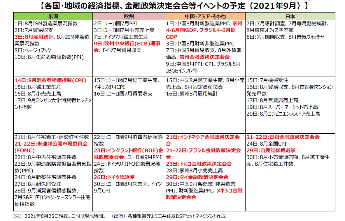 ■日本では、デルタ型の蔓延により、緊急事態宣言等の対象地域が拡大されており、今後も行動制限や感染者数の増加が景気の重石となることが懸念されます。こうした中、9月29日に予定される自民党総裁選挙や、それに続く衆議院総選挙といった政治イベントにも注目が集まります。
