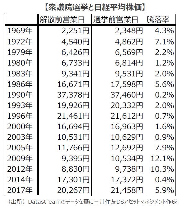 ■1969年以降に実施された衆議院選挙において、解散前営業日から選挙前営業日の日経平均株価は16回すべてで上昇しています。