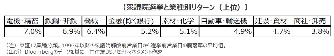 ■また、1996年以降の8回の衆議院選挙において東証17業種分類でリターンの平均を見ると、解散前営業日から選挙前営業日までの間に、電機・精密、鉄鋼・非鉄、機械などの景気敏感株が買われる傾向にあります。