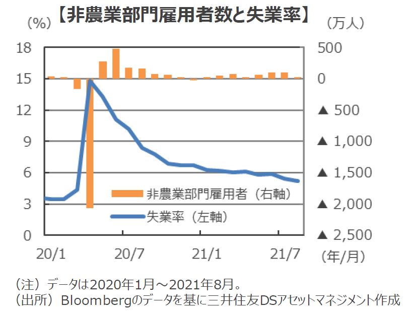 ■内訳では娯楽や教育関連の雇用増加が大きく減速しており、新型コロナウイルスのデルタ型の拡大によって雇用回復が一旦足踏みした格好です。