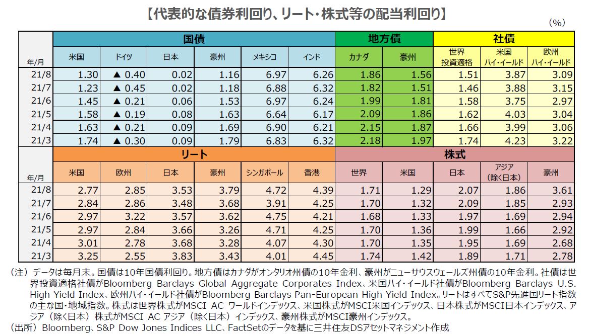 ■債券は、欧米において利回りが上昇しました。米国では資産購入の縮小(テーパリング)の開始時期が意識される中、長期金利は一時大きく上昇しました。その後、月末に行われたジャクソンホール会議で米連邦準備制度理事会(FRB)のパウエル議長が、年内のテーパリング開始を示唆しながらも、早期の利上げに慎重な姿勢を見せたこと等から、債券利回りの上昇幅はやや縮まりました。また欧州では、米国の長期金利上昇や投資家のリスク選好姿勢の高まりを背景に、債券利回りが上昇しました。
