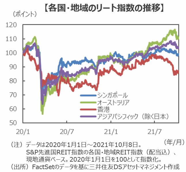 ■シンガポールリート市場は、長期金利の上昇や中国不動産大手の債務問題に加えて、月末にかけて新型コロナウイルスの新規感染者が急増し再度行動制限が強化されたことから下落しました。