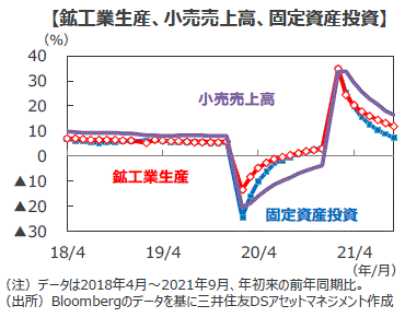 ■1~9月の鉱工業生産は前年同期比+11.8%と、1~6月の+15.9%から減速しました。コロナショックの影響を受けた昨年の反動を除外するため、2年間の幾何平均値でみても、1~9月は+6.4%と、1~6月(+7.0%)から減速しました。
