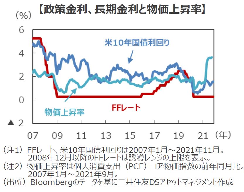 ■テーパリングが開始されたことで今後の金融政策の焦点は利上げ時期に移ります。パウエル議長は会見で、雇用者数と労働参加率の両面において最大雇用に達しているとは言えないと述べましたが、2022年後半にも達成できる可能性を示しました。また、一過性と考えられているインフレの高止まりが長引いていることについても、供給制約が解消する時期は見通しづらいとしています。利上げのタイミングを見通す上でも、雇用の回復ペースと、物価の高止まりが解消する時期に注目が集まります。