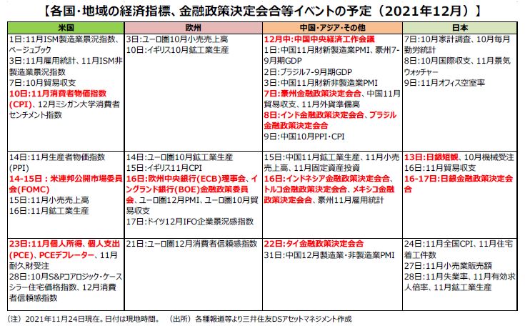 ■12月は日米欧をはじめ、主要各国において金融政策決定会合が予定されています。米連邦準備制度理事会(FRB)は11月の会合で、資産購入の縮小(テーパリング)を同月より開始すると発表しました。12月も引き続きテーパリングが実施される見込みです。米国では消費者物価の上昇が加速しインフレへの懸念も高まっており、パウエルFRB議長等高官の発言に注目です。一方、欧州中央銀行(ECB)は、域内の景気回復を受けて、新型コロナ対策であるパンデミック緊急購入プログラムの終了と、新型コロナ以前からの量的緩和策を2022年以降に拡大すること等を発表すると予想されます。また、イングランド銀行(BOE)は利上げに舵を切ると予想されます。