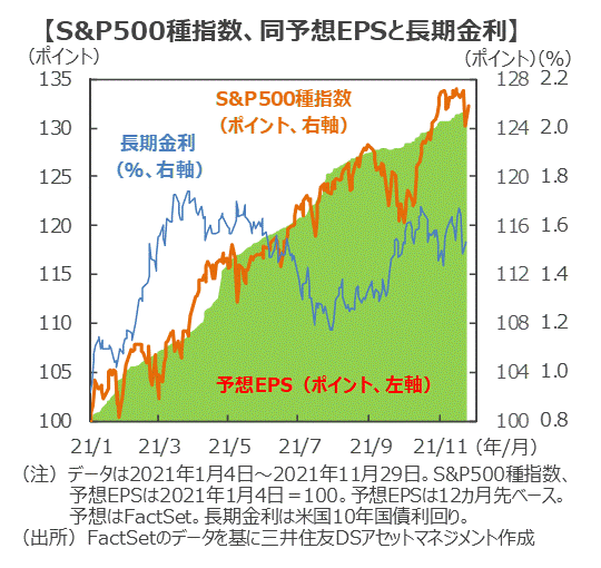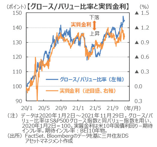 ■週明け29日の株式市場は、前週末の急落の反動から買い戻しが入り、一旦は落ち着きを取り戻しています。特にNASDAQ100指数は前週末比+2.3%と先週末の▲2.1%を埋めるなど、大型グロース株が総じて堅調でした。最近上昇していた実質金利も再び▲1%台に低下しました。オミクロン型に対する懸念は、長期金利の上昇を抑制する方向に作用しやすく、大型グロース株にとっては追い風となる可能性があります。