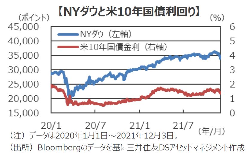 ■3日の市場で米国株は下落しました。新型コロナウイルスのオミクロン型への懸念が残る中でも、パウエル議長が金融緩和縮小に前向きな姿勢を見せていることから、これまで大きく上昇していたハイテク関連銘柄を中心に弱い動きとなっています。