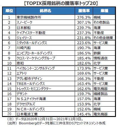 ■今年の日本株式市場(TOPIX採用銘柄)の騰落率上位を見ると、業績が上振れた小型株が多くを占めました。登山・キャンプ用品のスノーピーク、戸建て住宅分譲のケイアイスター不動産、賃料保証サービスのジェイリースなど、いずれも事前予想を上回る決算を受けて大きく上昇しました。