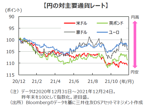 ■2021年の円の対米ドル相場は、もみ合う期間はあったものの、概ね円安基調となりました。昨年末に1ドル=103.25円だった円相場は、足元で114円台で推移しています。円は年初から弱含み、米長期金利が上昇したことから、3月には110円台を付けるなど、一方向で円安が進行しました。その後9月下旬までは108円~110円台のもみ合いが続きましたが、10月以降は、米国の物価上昇による米利上げ観測の高まりや原油高などを背景にした日本の貿易収支悪化観測から円が一段と売られ、11月下旬には約4年ぶりに115円台を付けるなど、レンジを切り下げました。