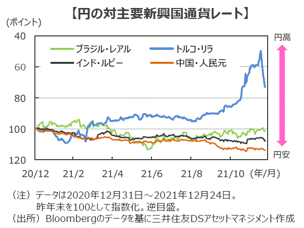 ■円は主な新興国通貨に対しては、まちまちの動きとなりました。中国・人民元は相対的に高い経済成長率を背景に対円で上昇基調を辿り、ほぼ一方向の円安が進行しました。インド・ルピーは、インドの景気回復期待などから緩やかな円安が進行しました。ブラジル・レアルは年前半、ブラジルの利上げや資源高を背景に堅調に推移しましたが、インフレや財政悪化の懸念から反落し、年初来では対円でほぼ横ばいとなりました。トルコ・リラは、脆弱なファンダメンタルズから軟調に推移するなか、トルコ中央銀行の金融政策への信用失墜から10月以降急落し、大幅な円高となりました。足元はトルコ政府の異例の通貨防衛策で急反発しました。