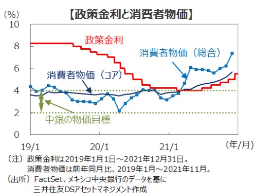 ■メキシコの金融市場にとって、2021年はインフレと利上げの年となりました。メキシコ銀行(中央銀行、中銀)は2月には景気への配慮から利下げを実施しましたが、年央以降はインフレの大幅な上振れから金融引き締めに転じ、政策金利は年央の4%から年末には5.5%まで引き上げられました。