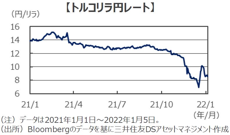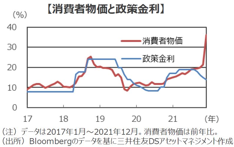 ■12月の消費者物価が前年比+36%になるなど、トルコではインフレが非常に速いペースで進行しています。低金利が経済にプラスに働くとの強い信念を持つエルドアン大統領は、利下げを求め総裁を含む中央銀行高官を更迭し、インフレと通貨安のスパイラルを招いていました。