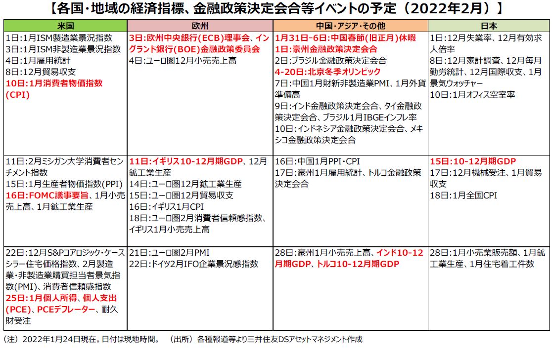 ■2月には、1月25日、26日に開かれる米連邦公開市場委員会(FOMC)の議事要旨が発表されます。米連邦準備制度理事会(FRB)は、昨年11月から量的緩和の縮小(テーパリング)を開始しました。その後、12月のFOMCでは利上げ予想などが引き上がり、更にその議事要旨ではバランスシートの縮小について突っ込んだ議論が交わされたことが明らかになりました。1月のFOMCでは、金融政策の大きな変更はないと思われますが、3月にも利上げ開始が見込まれる中、議論の中身にも注目です。また、FRBが金融政策の正常化を急ぐ背景には、消費者物価の大きな上昇があり、物価の動向にも注意が必要です。