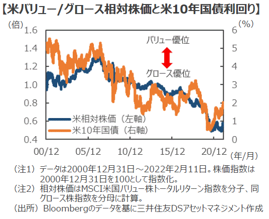 ■ちなみに、過去20年ほどの米国株式市場の動向を見ると、バリュー株とグロース株の優劣は、おおむね長期金利の動きに沿う形で推移しています。