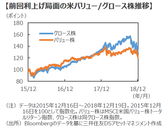 ■ちなみに、直近の利上げ局面(2015年12月16日から2018年12月19日)では、米国グロース株は約30%上昇しており、米国バリュー株を約10%アウトパフォームしています。