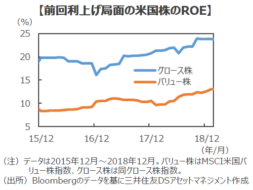 ■利上げ局面にもかかわらず米国グロース株が堅調に推移した背景には、前回の利上げが比較的小幅でそのペースも緩やかであったことも一因と言えそうです。しかし、米国グロース株の上昇にとってより重要であったのは、力強く事業を拡大し、高水準の株主資本利益率(ROE)を更に向上させた、高い収益性や盤石なビジネスモデルを背景にした力強い業績の伸びに他ならないでしょう。