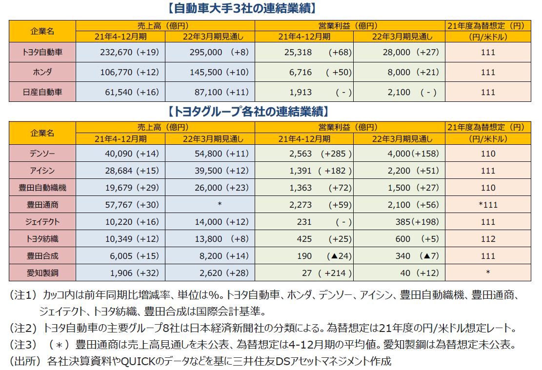 ■自動車大手3社の2021年度4-12月期決算は、コロナ禍で落ち込んだ前期の反動もあり、揃って前年同期比で増収増益となりました。半導体など部品不足による生産制約や原材料価格上昇の影響はあるものの、販売奨励金の抑制などコスト削減に加え、円安が追い風となりました。トヨタの営業利益は過去最高となりました。通期の業績予想については、トヨタが据え置き、ホンダと日産は上方修正しました。トヨタが通期の生産計画を引き下げるなど、足元で新型コロナウイルスの感染が再び広がり、供給制約から生産回復ペースが鈍る懸念が出ているため、3社とも売上高は下方修正しました。