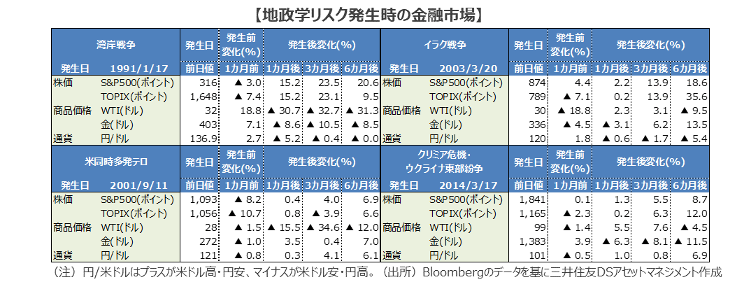 ■1991年以降、地政学リスクが高まった局面を月単位で整理すると、株式市場の下落は概ね発生日の前月以前であることが確認され、発生後はむしろ上昇していました。ロシア・ウクライナ情勢を巡っては、まだ、和平への筋道が見えておらず、不安定な状態に変化はありませんが、両国の停戦交渉等に筋道が見えれば、一旦は収束することも考えられます。過去の経験で地政学リスク発生時から3カ月後、6カ月後も株式市場は概ね上昇を維持している点も注目されます。