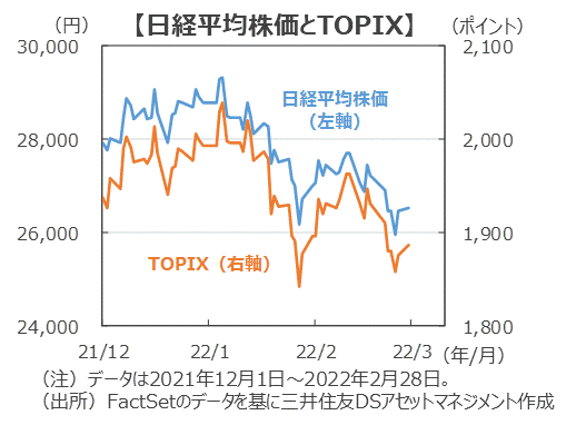 ■TOPIXは、ロシアによるウクライナ侵攻が伝えられた2月24日に日経平均株価と同様に下落しましたが、年初来安値を更新せずに踏みとどまりました。TOPIXは国内景気に対する期待から値固めが進んでいるとも考えられます。こうした局面下でTOPIXの12カ月先予想株価収益率は2月28日現在12.5倍です。2012年以降22年2月までの平均値マイナス1標準偏差は12.3倍で、これを一応の下値の目途とすると、足元のバリュエーションは割安圏にあると言えます。業績は総じて好調ですので、今後は割安圏での値固めが進むと考えられます。さらなる上昇には外部環境の安定が待たれ、引き続きウクライナ情勢や米国の物価と金融政策が注目されます。