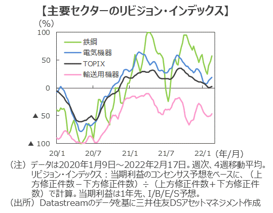 ■3月決算企業の10-12月期決算(TOPIX除く金融ベース)は当期利益が前年同期比+12.5%と堅調でした。1-3月期は外部環境が極めて不透明なため、業績への悪影響が懸念されますが、足元のリビジョン・インデックスを見る限りは堅調を維持しています。特に景気敏感セクターの鉄鋼の同インデックスは上振れており、機械なども好調です。電気機器や輸送用機器の同インデックスも反転し始めており、業績に対する期待が継続している点は安心材料です。