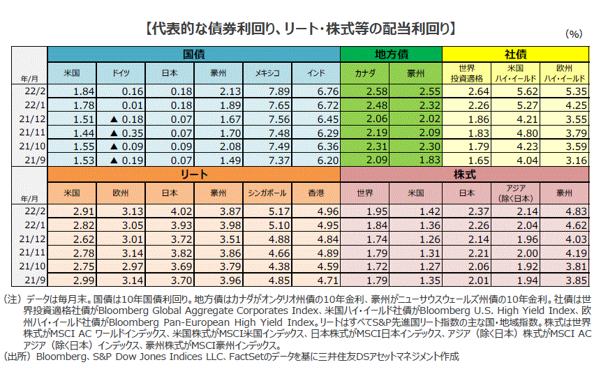 ■株式市場では、FRBによる金融引き締めへの懸念やウクライナ情勢の緊迫化によるリスク回避姿勢の強まりから、世界的に株価は軟調な展開となり、株式の配当利回りは上昇しました。