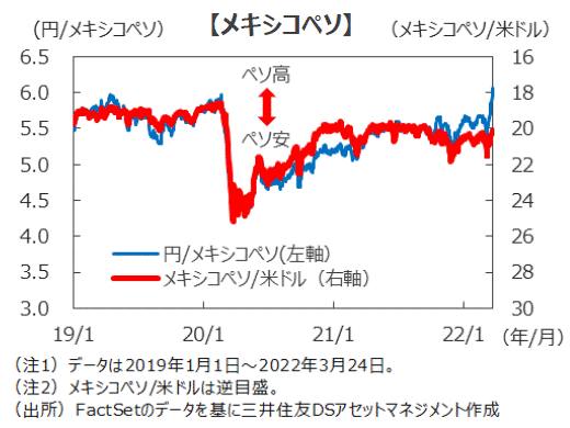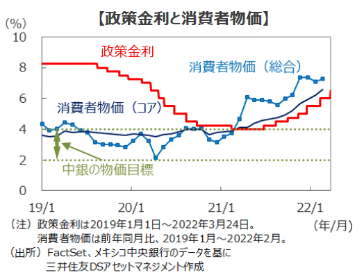 ■2月のメキシコの消費者物価指数は、食料品やエネルギー価格の上昇を主因に、前年同月比で7.28%の上昇となりました。ウクライナ情勢の影響もあり当面はインフレの高止まりが続くものと思われることから、弊社では2022年のインフレ見通しを従来の+4.5%から+5.5%に引き上げました。