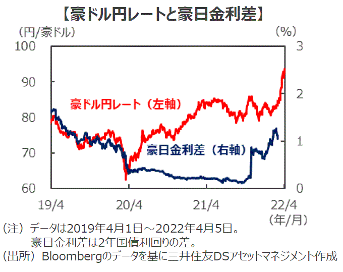 ■ウクライナ情勢は未だ不透明感が強いものの、資源価格は今後も高止まりするとの見方が多く、豪ドルには追い風です。一方で、資源価格の上昇は日本にとっては経常赤字に影響し、米国の利上げによる日米金利差の拡大から円安基調が見込まれます。豪州も利上げに舵を切れば、豪日の金利差も拡大するため、今後も豪ドル高・円安基調は続くと見込まれます。