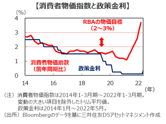 ■4月27日に発表された豪州の1-3月期の消費者物価指数(CPI)は前年同期比+5.1%、基調的な動きを示すトリム平均値では同+3.7%となりました。いずれもRBAが物価目標とする同+2~3%のレンジの上限を大きく上回っています。